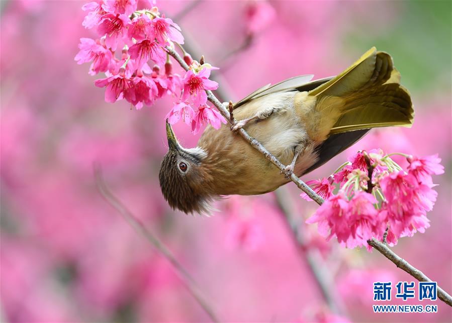 2月18日,一只綠翅短腳鵯鳥在福州森林公園櫻花園采食花蜜。隨著天氣轉暖,福州國家森林公園的2.5公頃櫻花園內櫻花盛開,引得眾多鳥兒前來采食花蜜,春色盎然。 新華社記者 姜克紅 攝