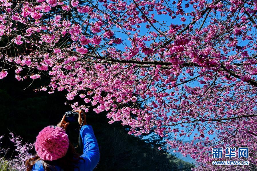 2月29日,游客在武陵農(nóng)場(chǎng)賞花。初春的臺(tái)灣,氣溫回升,位于海拔1700多米的臺(tái)中武陵農(nóng)場(chǎng),漫山遍野的櫻花競(jìng)相開(kāi)放,美不勝收,吸引了四面八方的游客前來(lái)觀賞。 新華社記者張國(guó)俊 攝