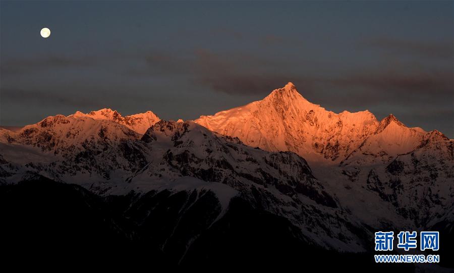 這是3月25日清晨拍攝的梅里雪山“日月同輝”景觀。梅里雪山位于滇藏交界的云南省迪慶藏族自治州德欽縣境內(nèi),是世界自然遺產(chǎn)“三江并流”的主要自然景觀之一。梅里雪山常年云霧籠罩,太陽光只在少數(shù)天晴的清晨照射在雪山頂上,形成絕美的“日照金山”美景。有時月亮尚未落山,太陽已經(jīng)升起,更是形成了難得一見的梅里雪山“日月同輝”奇觀。新華社記者 王長山 攝