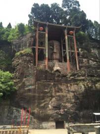 沿石梯而上,一面數(shù)百平米的石壁上,一尊大佛坐西向東,依巖而建。據(jù)測(cè)量,大佛高15.85米,寬11米。其中頭高7.7米,面寬4.6米。佛頭之上,一座木質(zhì)廊亭像一把巨傘,為其遮風(fēng)蔽雨。胸側(cè)各站一力士,均高1.9米,腰系裙,穿甲,甲紋似魚(yú)鱗,身繞帔帛,立于臺(tái)基上。大佛胸下部分與高聳巖石融為一體,氣勢(shì)磅礴。