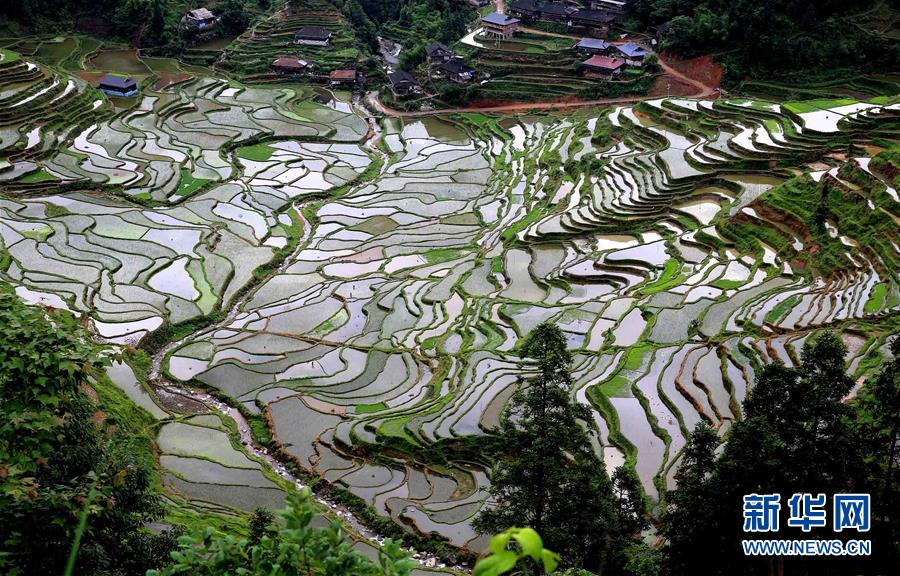5月20日在廣西柳州市融水苗族自治縣桿洞鄉(xiāng)拍攝的梯田。廣西柳州市融水苗族自治縣桿洞鄉(xiāng)平均海拔780多米,是全縣高海拔鄉(xiāng)鎮(zhèn)之一。這里的梯田多在高山,人們稱之為“天上糧倉”。時下,“天上糧倉”或儲水待插,或新秧初栽,如織錦一般美不勝收。新華社發(fā)(龍濤 攝)
