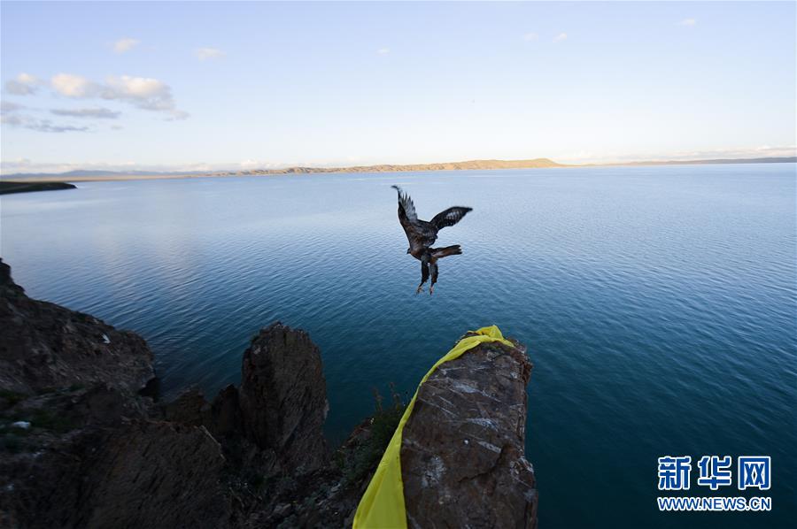 一只雄鷹在青海果洛藏族自治州瑪多縣扎陵湖上空飛翔(2014年7月31日攝)。新華社記者吳剛攝