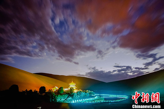 7月中旬,國際旅游名城甘肅敦煌進入旅游旺季,每天成千上萬的海內外游客來到當?shù)刂Q沙山月牙泉景區(qū)觀光游覽,觀賞大漠風光,感受敦煌文化,體驗民俗風情。傍晚時分,西邊的天空被晚霞染紅,美麗的月牙泉被寶藍色的燈光點綴著呈現(xiàn)出美輪美奐的闌珊夜色,大批游人沉浸于如夢如幻的迷人夜色里流連忘返。