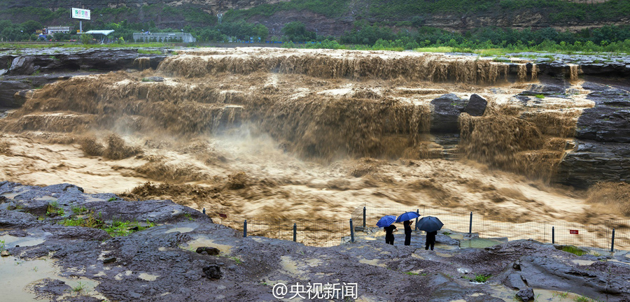 受上游強(qiáng)降雨和水庫(kù)放水影響,最近幾天,黃河壺口瀑布迎來(lái)伏汛,最大水流量達(dá)到每秒2600立方米左右,濁流滾滾奔騰而下,氣勢(shì)磅礴!(央視記者李志 文豪)