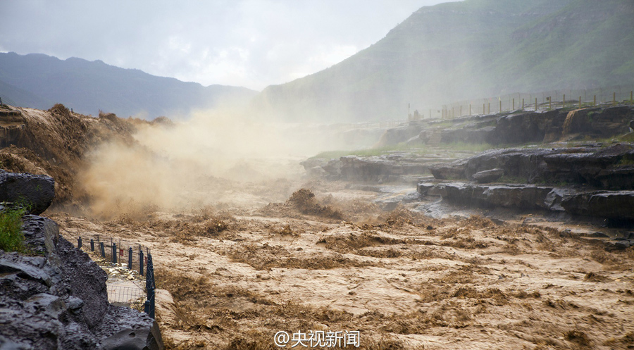 受上游強(qiáng)降雨和水庫放水影響,最近幾天,黃河壺口瀑布迎來伏汛,最大水流量達(dá)到每秒2600立方米左右,濁流滾滾奔騰而下,氣勢磅礴!(央視記者李志 文豪)