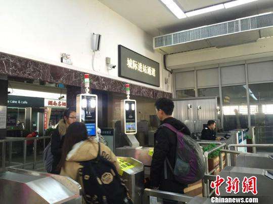 圖為長沙火車站內(nèi)乘客通過“票證人自助核驗閘機”“刷臉”進站。(魯毅 攝)