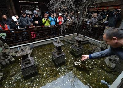 中午時分,記者又一次仔細觀察了水池,在游人拋投硬幣時,確實有一兩條金色的觀賞魚在石縫處游動著。在木制欄桿四周,正貼著“禁止倚靠欄桿”、“禁止投幣”等字樣?!按汗?jié)游客爆滿,水池是從寬巷子到窄巷子的必經(jīng)之道,加上很多人在拋硬幣,頓時人滿為患。我們只好打印了幾張?zhí)嵝褟堎N起來?!鞭k公室工作人員還表示,“等春節(jié)游客潮稍微退卻,天氣回暖,我們就要派人下水打撈這些硬幣,用于景點建設(shè)?!?/p>