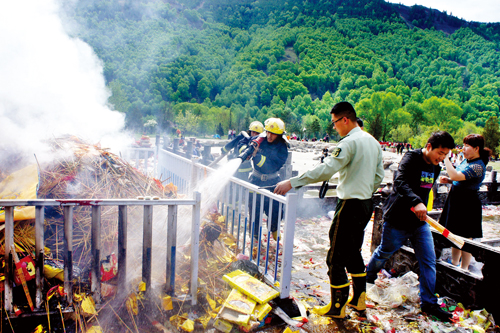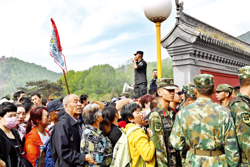 19日上午,中心區(qū)旅游人數(shù)達(dá)到峰值,五爺廟前的廣場(chǎng)是安保壓力最大的區(qū)域,按照活動(dòng)《方案》建立了兩道隔離帶,公安民警、武警、消防、保安緊密協(xié)作,分兵把守,有序放行。在五爺廟前的焚香區(qū),武警戰(zhàn)士組成人墻迎接一浪高過(guò)一浪的人潮沖擊,確保了萬(wàn)千游客的絕對(duì)安全,豆大的汗珠順著他們的臉頰不斷流淌。