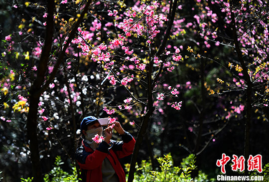 郊野公園里一位在用手機(jī)拍攝盛開桃花的市民。 中新社記者 李進(jìn)紅 攝