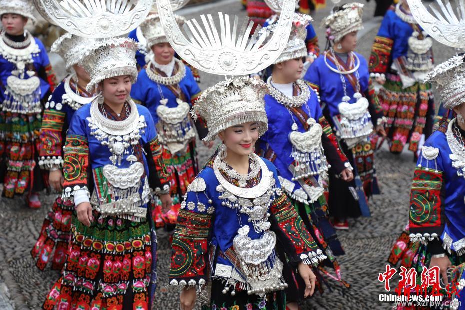 11月18日,苗族姑娘穿著盛裝參加巡游。當日,貴州省黔東南苗族侗族自治州雷山縣舉行2018苗年巡游活動,來自海內外的上萬名游客和當?shù)孛缱逋黄饸g聚,慶祝苗族新年。中新社記者 瞿宏倫 攝