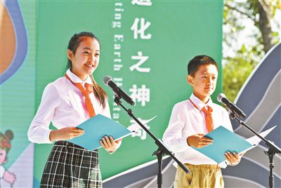延慶世界地質(zhì)公園的小志愿者誦讀了設(shè)立“地質(zhì)公園日”的綠色倡議書攝影/本報(bào)記者 魏彤