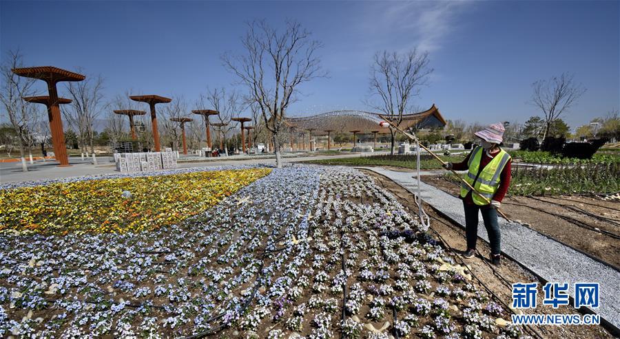 4月14日,園林工人在澆灌新種植的花卉。 近期,北京世園會園區(qū)景觀恢復(fù)工作全面啟動,將在4月28日前恢復(fù)近5萬平米的世園標(biāo)志性花卉景觀,以及70余個室外展園。 新華社記者 李欣 攝