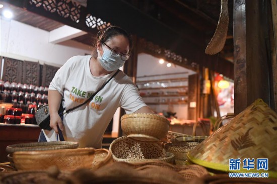 6月11日,游客在湘西土家族苗族自治州永順縣芙蓉鎮(zhèn)景區(qū)內(nèi)選購手工制作的旅游商品。 新華社記者 薛宇舸 攝