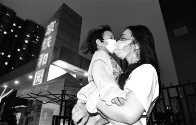 昨晚8點(diǎn)剛過,京鐵和園小區(qū)已有居民走出小區(qū),前往附近的超市、公園。在小區(qū)門口,3歲的多多老遠(yuǎn)就看到門外的媽媽,高興壞了。多多的媽媽告訴北青報(bào)記者,孩子一直住在京鐵和園的奶奶家,社區(qū)封閉后,她只能晚上隔著大門看看孩子。聽說昨晚社區(qū)解除封閉,她特意趕過來想抱一抱多多。不過,由于多多和奶奶的出入證正在辦理中,孩子還不能走出小區(qū)。在征得門口值守人員的同意后,多多跟媽媽終于在小區(qū)外重逢,母子倆擁抱在一起。