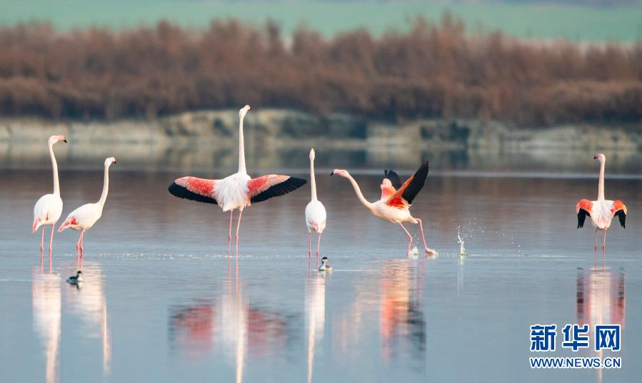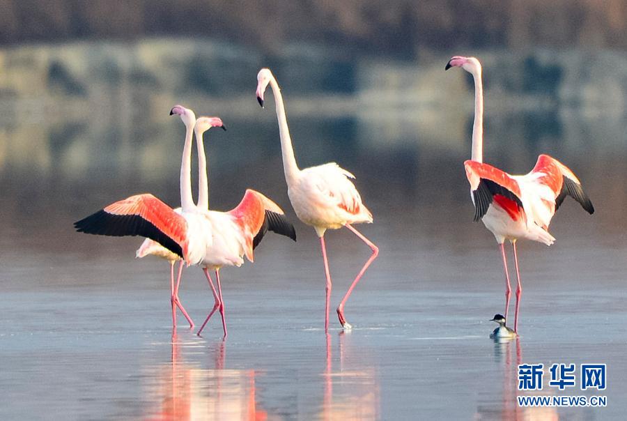 隨著氣溫下降,一些火烈鳥飛抵山西運(yùn)城鹽湖,成為冬日鹽湖一道美麗的風(fēng)景。