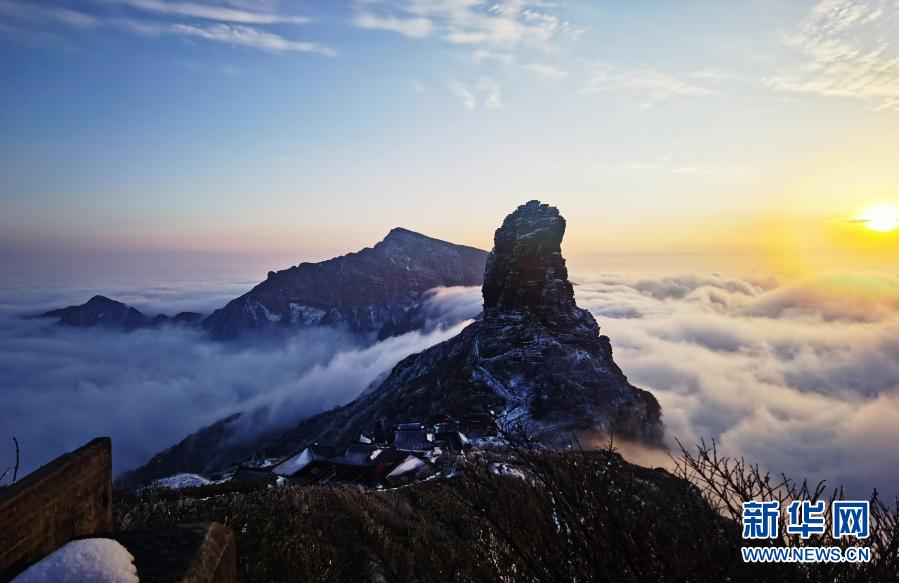 1月17日在貴州銅仁梵凈山拍攝的夕陽云海景觀。