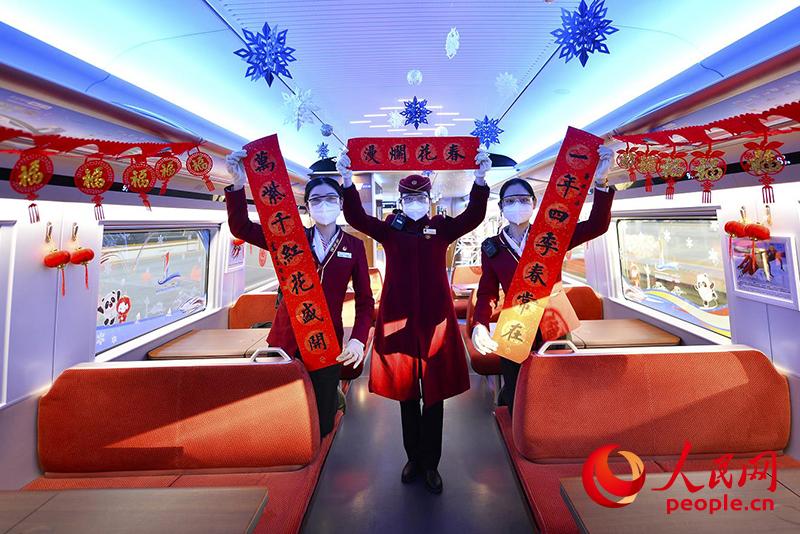 2021年春運(yùn)是疫情防控常態(tài)化下的首個春運(yùn),全國上下提倡就地過年,鐵路部門科學(xué)調(diào)整運(yùn)力,努力實現(xiàn)“平安春運(yùn)、有序春運(yùn)、溫馨春運(yùn),讓旅客體驗更美好”的春運(yùn)目標(biāo)。2021年2月4日,正值北方小年,同時也是北京2022年冬殘奧會開幕倒計時一周年,北京局集團(tuán)公司北京客運(yùn)段京張高鐵車隊擔(dān)當(dāng)?shù)腉8881次列車始發(fā)前,列車工作人員用窗花等裝飾品布置車廂,打造溫馨的出行環(huán)境,營造濃濃的“年味”。(圖片來源:北京鐵路局集團(tuán)公司北京客運(yùn)段 毛衛(wèi)華 攝)