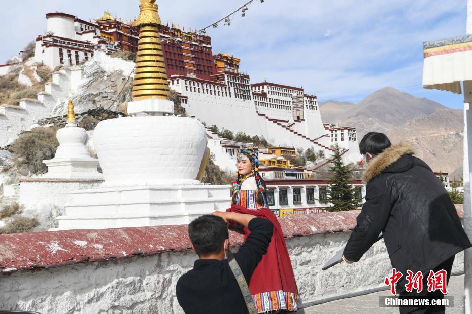 3月15日,游客在拉薩藥王山觀景臺(tái)身著藏族傳統(tǒng)服飾拍照留念。 中新社記者 貢嘎來(lái)松 攝