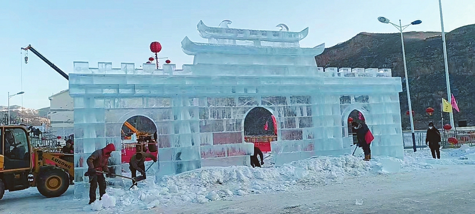 圖為偏關(guān)老牛灣景區(qū),冰雕師傅們正精心打磨冰雕作品。 本報(bào)記者攝