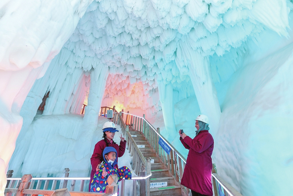 七月二十七日,在鄉(xiāng)寧縣云丘山景區(qū)超大冰洞群,游客在拍照留念。盛夏時節(jié),這個奇妙夢幻的冰雪世界,吸引了數(shù)以萬計的游客。閆銳鵬攝
