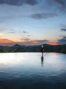 白天,游人可以搭乘索道登上葛仙山,行在山中,可見清泉瑩然,苔蘚盈階、云海翻騰,可聽泉水響動,天色如夢變幻。葛仙山的翠竹、樹木極多,是一道天然的屏障,趕在落日之前,快步來到葛仙村無邊泳池,赴一場“橘色云朵+藍色池水”的浪漫。