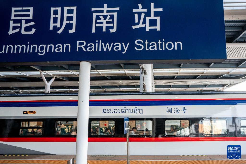 2月14日,中老鐵路國(guó)際旅客列車從昆明南站發(fā)車。