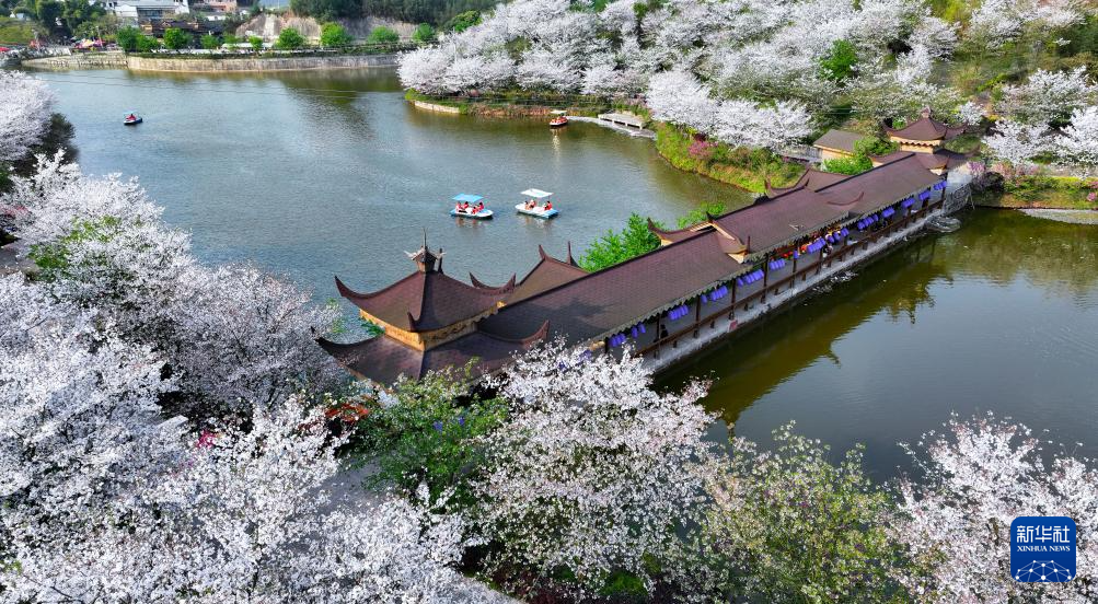 3月24日,游人在瀘州市江陽區(qū)丹林鎮(zhèn)建設(shè)村“櫻花谷”泛舟賞櫻(無人機照片)。