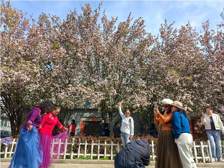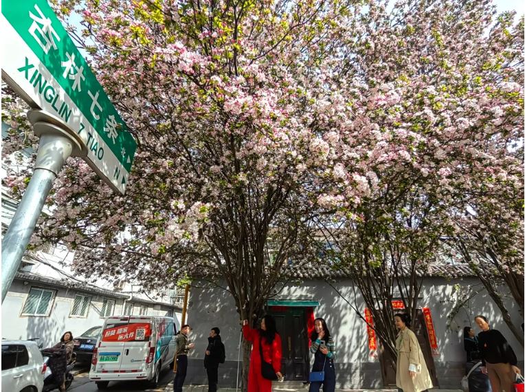 “一朵海棠露春芳,一樹海棠春滿堂?!薄斑@個路牌也太春天了吧,趁著春光明媚,帶上相機來打卡吧?!薄斑@幾天,這里成了最浪漫的打卡地,喜歡拍照的,趕快去吧!”杏林七條海棠花綻放,從去年海棠盛開時就火爆出圈,幾十米長的小巷總能看到游人如織的場景,這處隱匿在鬧市中的花海如此熱鬧,許多市民都是看到短視頻后慕名而來,希望與這片美麗花海來一次親密接觸。