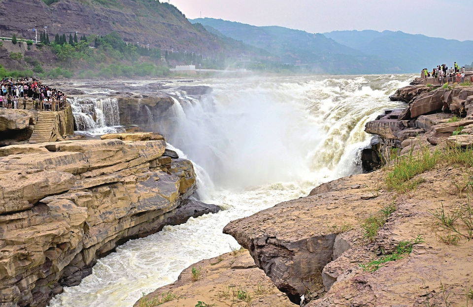 7月2日,游客在吉縣黃河壺口瀑布景區(qū)游覽觀瀑。近日,黃河進入主汛期,受上游降雨增多和水庫調節(jié)放水影響,黃河壺口瀑布水量大增,吸引了眾多游客。