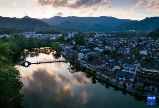 夏日傍晚時(shí)分,在擁有900多年歷史的中國(guó)傳統(tǒng)古村落、位于安徽省黃山市黟縣的宏村,湖面倒映著晚霞,游人在橋間駐足流連,享受季夏夜晚時(shí)光。