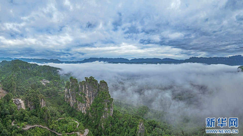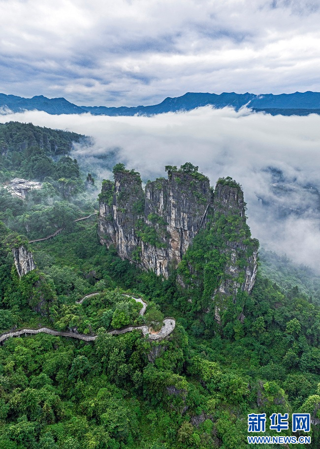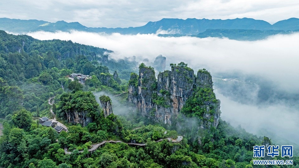 圖為清江紅花峰林景區(qū)云遮霧罩。新華網(wǎng)發(fā) 文林?jǐn)z