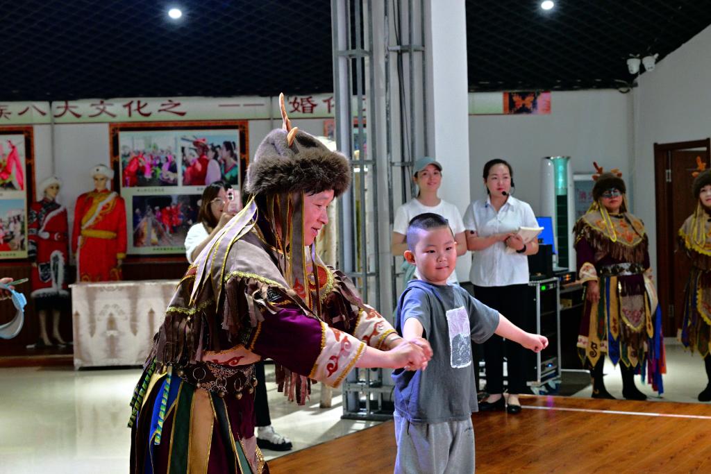在展示館二樓活態(tài)展示區(qū),赫哲族演員頭戴鹿角帽,身穿民族服裝,跳起熱烈的“溫吉尼”舞蹈,為前來參觀的游客帶來一場神秘又震撼的視聽盛宴。表演結(jié)束后,游客還可以走上舞臺(tái),和演員們學(xué)習(xí)薩滿舞的舞蹈動(dòng)作,體驗(yàn)赫哲族古老的文化。