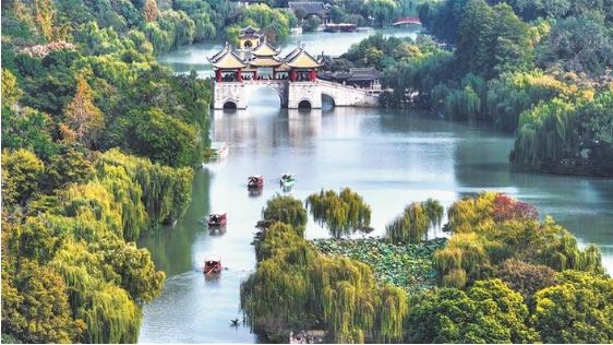 10月28日,游客在江蘇揚(yáng)州瘦西湖風(fēng)景區(qū)游玩賞秋。金秋十月,神州大地色彩斑斕,秋色迷人。 新華社發(fā)(齊立廣 攝)