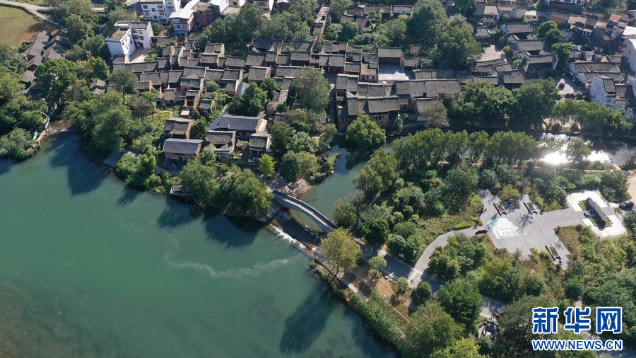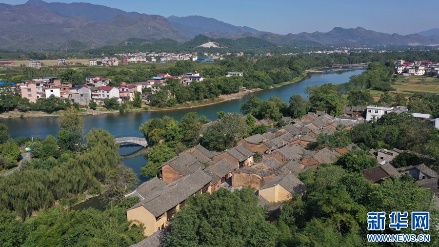 江口村布局呈現(xiàn)魚骨狀,沿著河道及山腳分布。(新華網(wǎng)發(fā) 汪家榮 攝)