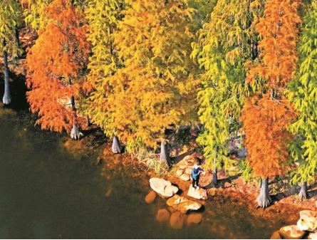 隨著天氣轉(zhuǎn)冷,廣西南寧市多個(gè)公園的杉樹(shù)樹(shù)葉愈發(fā)紅艷,分外靚麗。圖為12月21日,市民在廣西南寧市青秀山風(fēng)景區(qū)的杉樹(shù)林里游玩。 新華社記者 周華攝