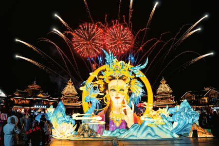 夜幕降臨,園區(qū)瞬間切換至另一番驚艷景象。神州塔下的演藝廣場(chǎng),將以濃烈的“國(guó)風(fēng)+國(guó)潮”風(fēng)格開(kāi)啟夜場(chǎng)演出。威風(fēng)凜凜的舞龍舞獅、婀娜多姿的古典舞蹈等各類表演將輪番上陣,令人目不暇接。隨著演出漸入高潮,夢(mèng)幻的燈光秀將伴隨著音樂(lè)節(jié)奏明滅閃爍,在夜色中勾勒出美輪美奐的光影畫(huà)卷。讓人最為期待的煙花秀將壓軸登場(chǎng)。隨著絢麗的煙花轟然沖向夜空,剎那間綻放成五彩斑斕的花火,整個(gè)園區(qū)都仿佛被點(diǎn)亮了,沉浸在一種亦真亦幻的絕美氛圍中。