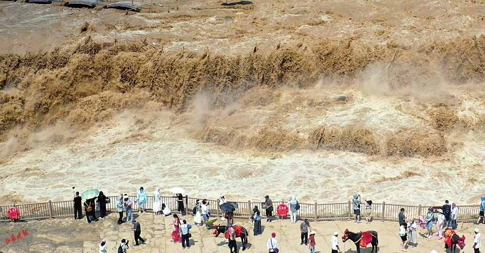 近日,受上游降雨增多及萬家寨水庫(kù)調(diào)水調(diào)沙放水影響,黃河干流進(jìn)入汛期。位于晉陜兩省交界處的壺口瀑布水量驟增,每秒流量突破1800立方米,主瀑與副瀑連成壯闊一線,昔日分散的水流此刻匯聚成氣勢(shì)磅礴的瀑布群,盡顯“黃河之水天上來”的雄渾壯美。這一難得的景觀吸引了大批游客慕名而至,爭(zhēng)相目睹大自然的磅礴奇觀。