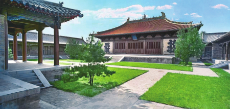 永安寺,原稱渾源州永安禪寺及神州大永安禪寺,俗稱“大寺”,始建于金,金元之交被火毀后重建,明、清以來均曾在當?shù)毓賳T倡導下續(xù)建與增修。該寺位于渾源古城東北隅,坐西北朝東南,本為以中軸線為主,東西軸各輔以跨院或偏院的五進場院空間大型寺廟建筑群,現(xiàn)僅存前院及東西跨院和中院主體建筑群,東西寬52米,南北深78米,占地面積4056平方米。寺內(nèi)現(xiàn)存文物建筑物7座、清代壁畫305.4平方米、建筑彩畫2118平方米,古代碑碣2方,石獅一對。主殿傳法正宗殿為元延祐二年(1315年)原構,是我國建筑史上廡殿頂建筑的杰作,殿內(nèi)滿堂水陸畫、建筑彩畫及殿頂五彩琉璃均保存完好且異常精美,聞名遐邇。