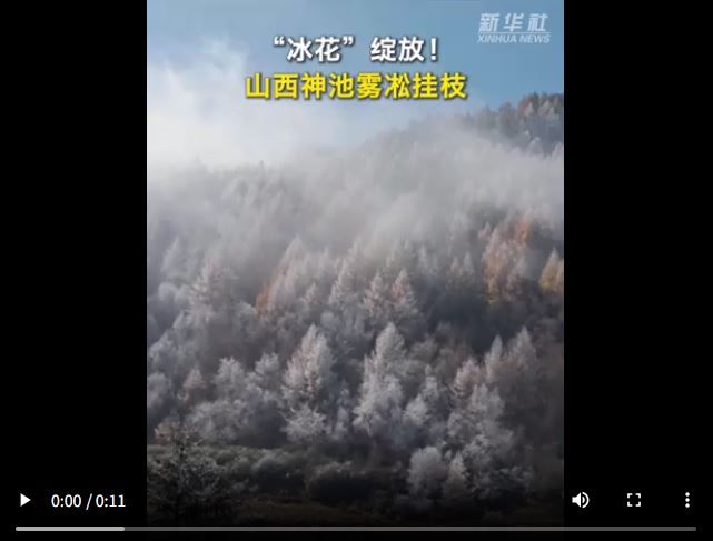 初冬時(shí)節(jié),山西神池國(guó)家登山步道出現(xiàn)霧凇景觀。金色的樹(shù)枝上掛滿冰晶,微風(fēng)徐來(lái),霧凇輕盈搖曳,還有牛羊在山坡上悠閑地吃草。霧凇宛如一層白色的薄紗,將整個(gè)森林籠罩其間,如夢(mèng)如幻。