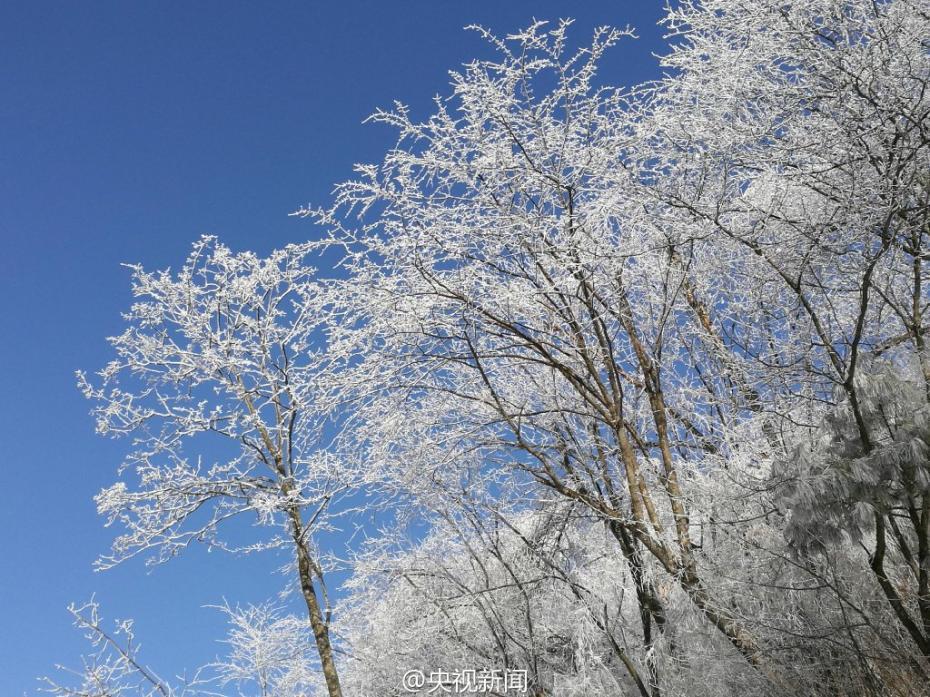 受較強冷空氣影響,秦嶺腹地涼風(fēng)埡山頂,出現(xiàn)大面積霧凇景觀。玉樹瓊枝,晶瑩剔透,讓涼風(fēng)埡山頂變得像童話世界一般,美不勝收。 央視記者王志杰 圖片來源:央視新聞微博