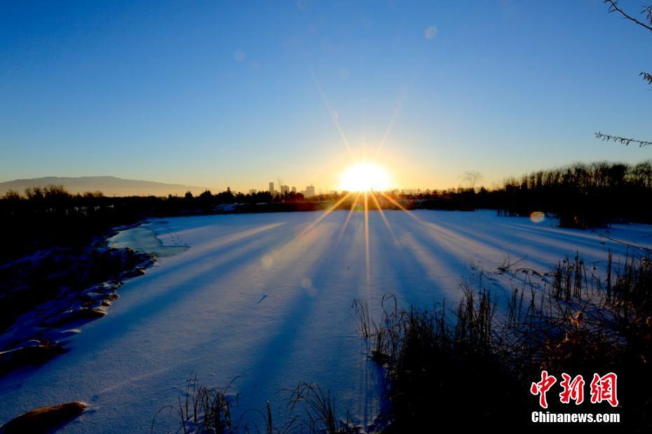 寒冬時節(jié),雪后初晴,地處甘肅河西走廊的張掖市濱河新區(qū)人工湖被白雪覆蓋,涓涓細(xì)流形成晶瑩剔透的冰瀑、冰掛,成為冬日一景。 陳禮 攝