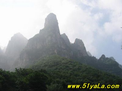 五老峰史稱東華山,歷史上為北方道教名山,海拔1809.3米,奇峰險峻,需攀鏈而上,屬丹霞地貌。這里是層層峰巒,森林古木,各種生物覆蓋著整個山野?;t草綠,山光水色,風(fēng)光旖旎非凡,故有“北有五臺觀庫存宇,南在五老看風(fēng)光”之說。游人往縣城西南遠眺,見有東錦屏峰、西錦屏峰、太乙坪峰、棋盤山峰四山峰仙態(tài)神姿,隱現(xiàn)于云煙蒼茫之中,將高1809.3米的玉柱峰環(huán)抱其中,“有偃蹇傴樓之伏”,猶如五位老人抱拳作揖迎貴賓之勢,故名五老峰。