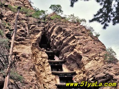 北洞是主體建筑部分。中區(qū)有大殿三間,座北向南。原為道教三清塑像,后被佛教改成三世佛。左右耳殿,另有東西配殿各三間,南閣一間。東側(cè)迎面山壁上,自然形成龐大的三角形石縫,內(nèi)有天然石洞,景觀奇特。石縫上端,外建五層樓閣。依崖開(kāi)鑿卯洞,梁架結(jié)構(gòu)與崖石交接構(gòu)筑,建造精巧。閣內(nèi)設(shè)有鐵索,扶鐵索可攀援而上。在閣的東邊又有一洞,內(nèi)建殿三間,名九仙女閣,塑九仙女像。箭閣外塑趙杲泥像,頭頂距石崖僅二指半,故舊稱“趙杲觀,離天二指半”。再往南,就是趙杲觀最險(xiǎn)峻的景觀了。峭峰高處,半山腰中,山洞前面,建樓三間。一眼望去,高閣懸空,上峭崖,下絕壁,左右山石如刀削。上下左右根本無(wú)路可通。山洞中垂下一條長(zhǎng)約20米的鐵索,成了進(jìn)洞的唯一途徑。只有勇敢的虔誠(chéng)者或探險(xiǎn)者,方可垂直攀索而登,一般人只能望樓興嘆,故鐵索被譽(yù)為“仙閣云梯”。三層樓建筑后依山洞,前為磚木結(jié)構(gòu)。上層內(nèi)塑太上老君、無(wú)始天尊、通天教主。中層內(nèi)塑關(guān)圣帝君。下層供修持者居住。當(dāng)時(shí)修筑情景,真令人難以想像。北洞群落,地形險(xiǎn)要,峰巒競(jìng)秀,古木參天,峭峻幽邃,設(shè)計(jì)大膽,造型奇特。人夸“雁北懸空寺,不及代州趙杲現(xiàn)”說(shuō)的并不過(guò)分。