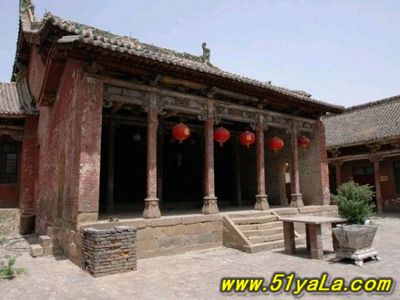 山門(mén)最古,為金時(shí)原構(gòu),五開(kāi)間,兩層,下層磚砌高臺(tái),中柱上裝青石門(mén)框及板門(mén),門(mén)框上線刻花紋,圖案秀美。上層施平座及勾欄,粱架現(xiàn)整簡(jiǎn)潔,結(jié)構(gòu)已具元代爬梁的雛形。屋頂琉璃為明代補(bǔ)制,鮮麗勁秀。這種高臺(tái)以上的門(mén)廡或殿宇,見(jiàn)宇敦煌壁畫(huà),實(shí)物中少有。