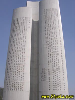 高40公尺的主碑 ,形如一把鋒利的刺刀 。主碑的三個(gè)面上,分別鐫刻著彭真、徐向前、薄一波的題詞。彭真的題詞是“戰(zhàn)績輝煌,永垂史冊”;徐向前的題詞是“參加百團(tuán)大戰(zhàn)的烈士們永垂不朽”;薄—波的題詞是“百團(tuán)大戰(zhàn),抗日戰(zhàn)爭中最光輝的一頁,必將載諸史冊,永放光芒?!?/p>