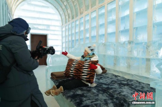 冰堡體驗(yàn)休息室布置了冰床、冰沙發(fā)等冰制陳設(shè),讓游客沉浸式體驗(yàn)冰雪住宿的新奇樂(lè)趣。 趙宇航 攝
