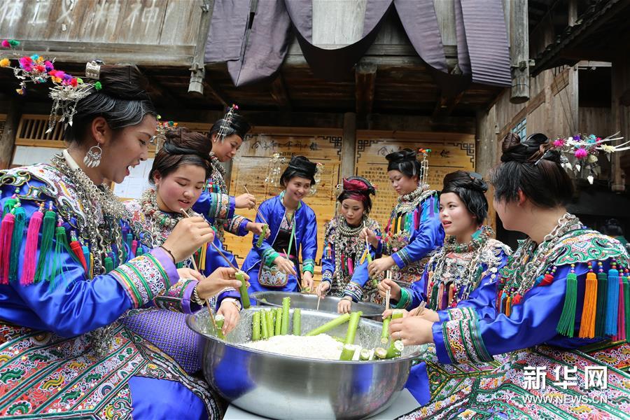 5月3日,貴州省首批魅力侗寨——榕江縣烏公侗寨歡度傳統(tǒng)的竹米節(jié),重溫侗民遠(yuǎn)古農(nóng)耕風(fēng)情。竹米節(jié)也叫吃竹筍飯,在每年谷雨至立夏期間竹筍生長(zhǎng)的時(shí)候,侗族群眾采摘斑竹筍,把糯米灌進(jìn)筍筒煮熟食用。這樣既能保持米飯的原味,又有竹筍的清香,并且還方便攜帶至坡上田間地頭食用。久而久之,侗族人每到春夏之交的農(nóng)耕時(shí)節(jié)都會(huì)過(guò)竹米節(jié),殺豬宰羊祭祀侗族祖先,唱歌跳舞祈求五谷豐登。新華社發(fā)(楊成利 攝)