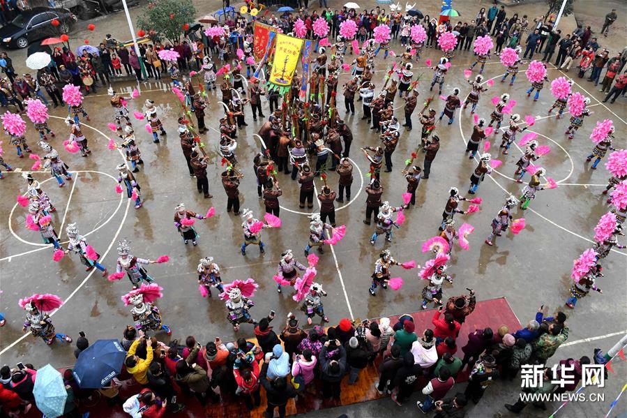 2月7日,廣西融水苗族自治縣安太鄉(xiāng)苗族群眾開展傳統(tǒng)的“打同年”民俗活動。當地數百名苗族同胞與游客們歡聚一堂,一起開展對歌、蘆笙踩堂、文藝晚會等活動,歡慶新春佳節(jié)。 “打同年”是融水苗族村寨的一種民俗,即友好村寨之間的拜年聯歡活動。新華社記者 李斌 攝