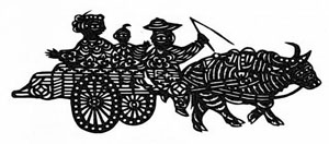 《姥爺送外甥》是靜樂民間老剪紙藝術(shù)家辛芙英早年的一幅剪紙,也是靜樂剪紙最具代表性的一幅名作,現(xiàn)收藏于中國美術(shù)館。這幅剪紙表現(xiàn)了閨女住完娘家之后,由父親(外甥的姥爺)趕著牛車送閨女和外甥回家的場面。剪紙人物造型生動(dòng)形象,樂趣橫生,令人百看不厭。