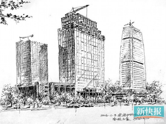 “以前工作日需要上班,我就利用周末在街巷間走動(dòng),看到地標(biāo)建筑就開始畫。遇到正在施工的高樓,我就計(jì)算著日子,到高樓即將封頂?shù)臅r(shí)候,我就帶上紙筆到施工現(xiàn)場(chǎng)畫畫。”吳立中介紹。